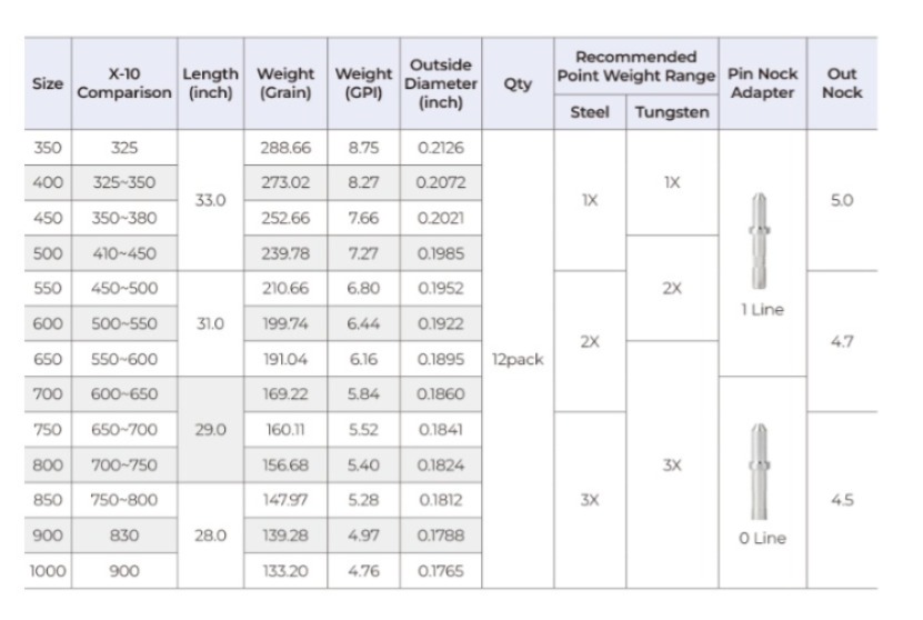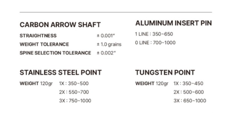 Strainghtness ± 0.001” Weight Tolerance ± 1.0 grains Spine Tolerance ± 0.002”